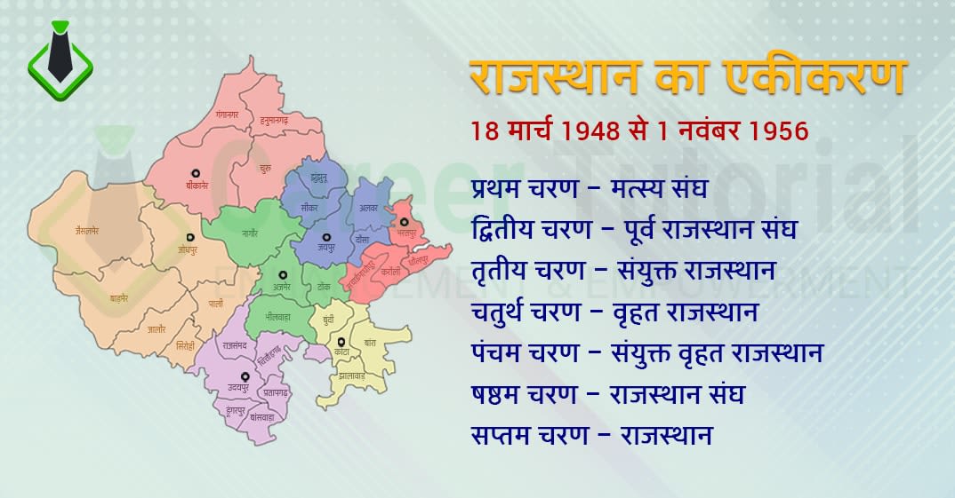 राजस्थान के एकीकरण का श्रेय सरदार वल्लभभाई पटेल को दिया जाता है। राजस्थान का एकीकरण 7 चरणों में पूरा हुआ राजस्थान का एकीकरण 18 मार्च 1948 से शुरू होकर 1 नवंबर 1956 को पूरा हुआ इसमें 8 वर्ष 7 माह 14 दिन लगे।